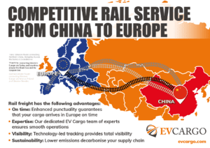 Efficiently transporting goods from key Chinese manufacturing hubs is at the foundation of operations for many businesses. That’s why at EV Cargo, we have a vast strategic network of freight solutions that allow shipping from China to Europe in a reliable, regular and cost-effective manner.